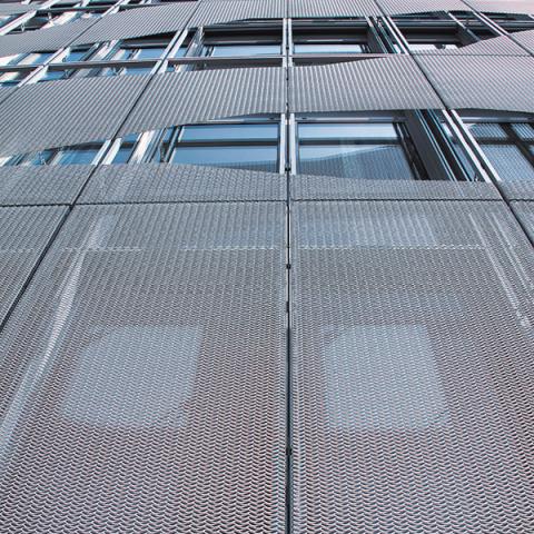 Una forma ispirata al mondo dei cristalli. Una pelle in rete stirata con 'strappi' a forma di uccelli e di nuvi. Una facciata funzionale con effetto frangisole realizzata da Metalltech con una maglia asimmetrica in alluminio anodizzato naturale.